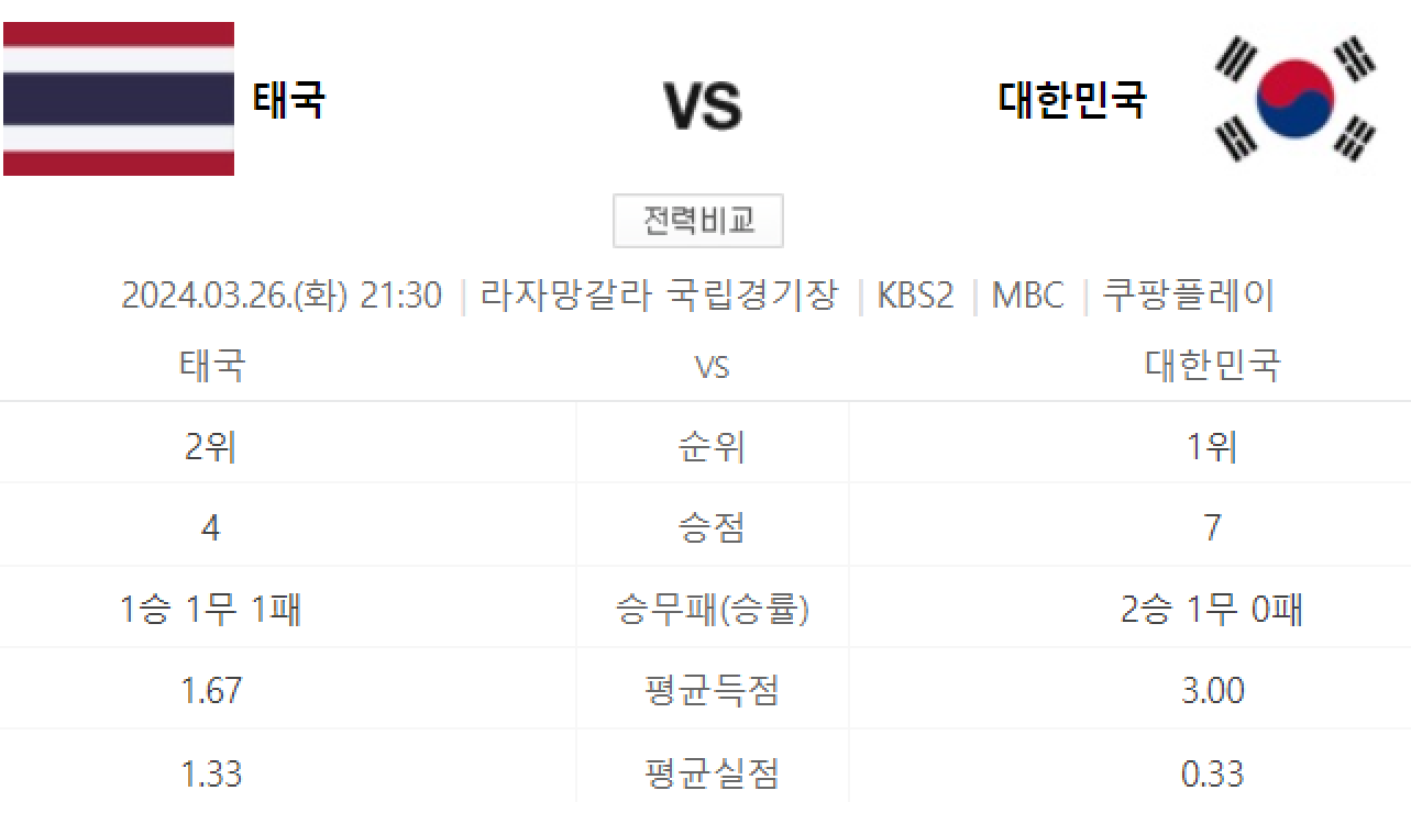 한국 Vs 태국의 경기 정보 및 선수
