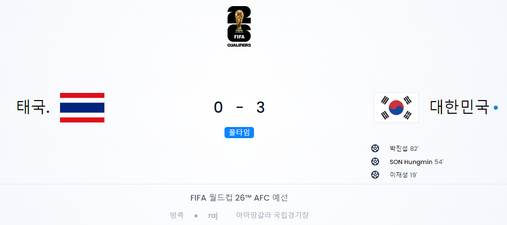 - 대한민국은 태국을 3-0으로 완승하며 2차 예선 4승 1무(승점 13점)로 조 1위를 확정했습니다.